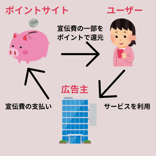 企業は自社の商品やサービスをポイントサイトに掲載し、ユーザーがその商品やサービスを購入したり利用したりすることによって、ポイントサイトは企業から広告料を得ています。